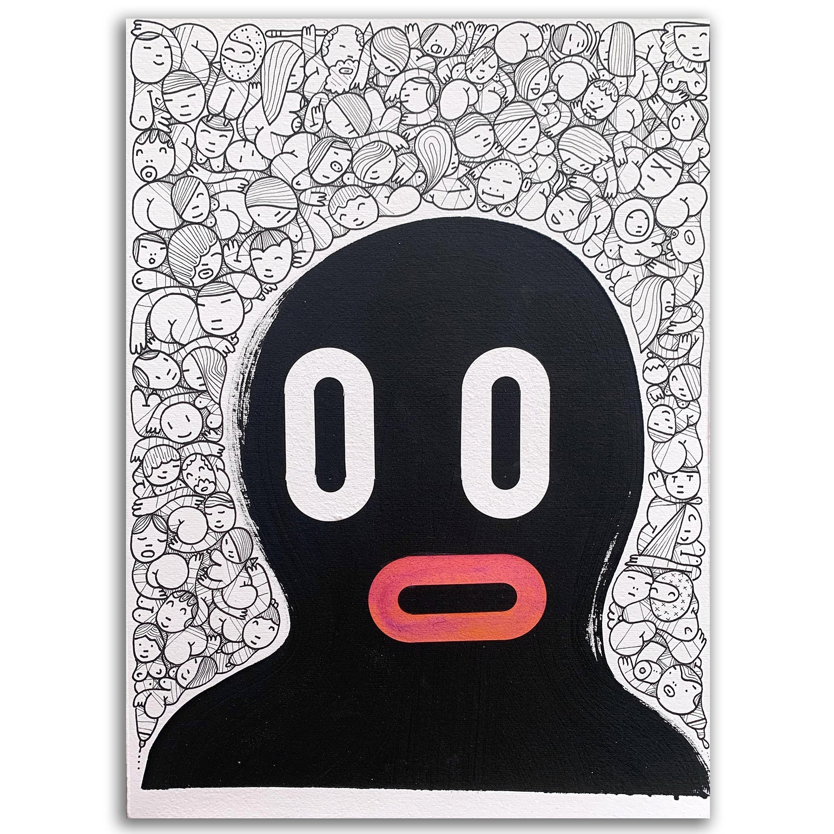 Bimbo is the famous character that has given Boris Hoppek worldwide recognition. A black figure with red lips that the artist has painted in numerous forms and situations, both on canvas or paper and on street walls. Bimbo is his most recognizable icon and serves to tell stories of social denunciation and show his black humor and political criticism. To have one of these originals is also to have a bit of the most committed urban art of the 2000s, pioneer of the new figuration of contemporary art that is so much in demand today by art collectors around the world.