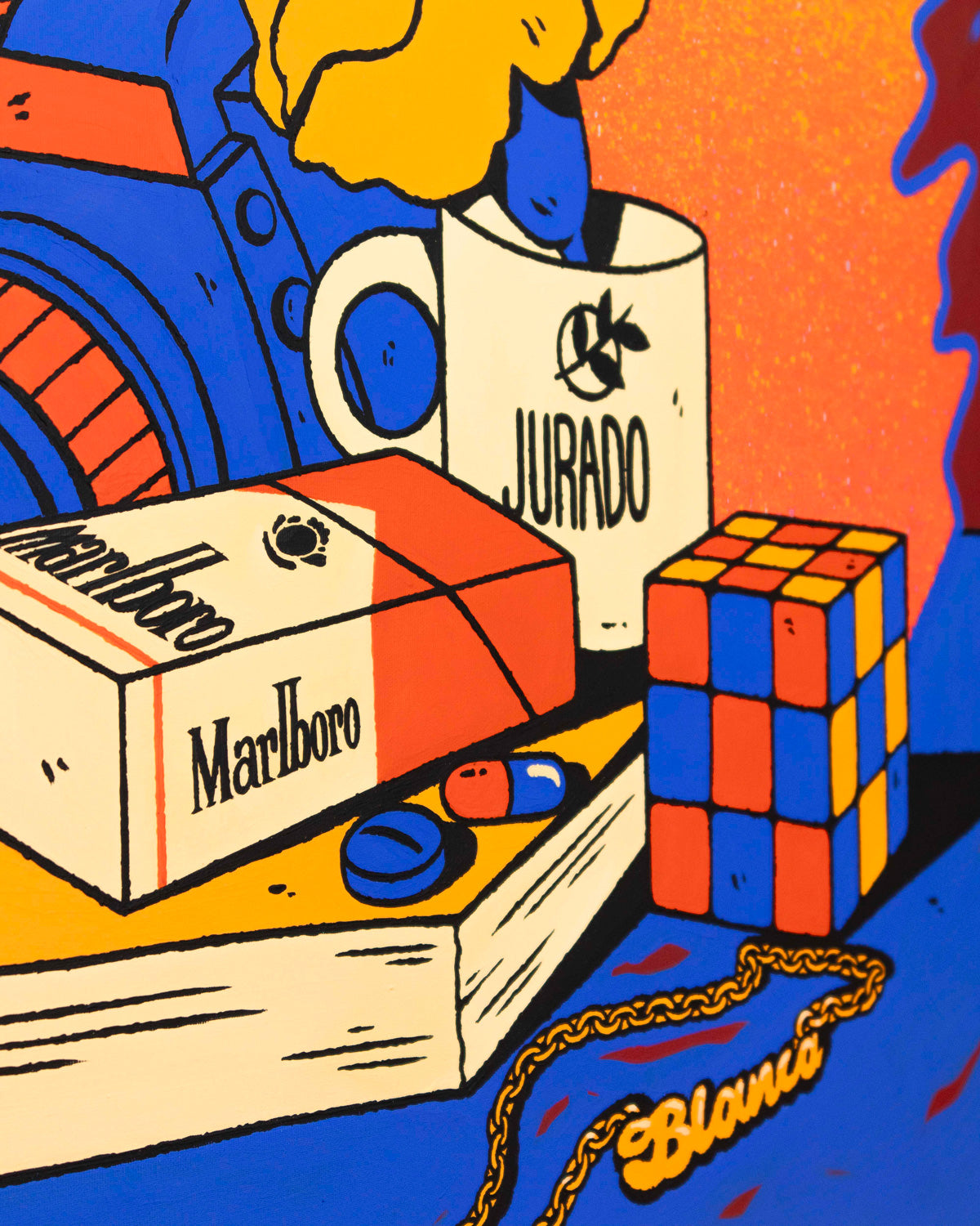 Be Fernández's still life paintings reveal the artist's most personal side, depicting memories, people, experiences, and emotions through the several elements which compose the works. In this scene, the light of the fire illuminates a still life in which each element burns, becoming part of the past. Everything in the scene seems to be a contradiction: seemingly inert objects, all consumed by the fire, yet simultaneously intensified by it, causing the pieces to merge and blend in a chromatic chaos. A reflection on change, the passage of time, and detachment.