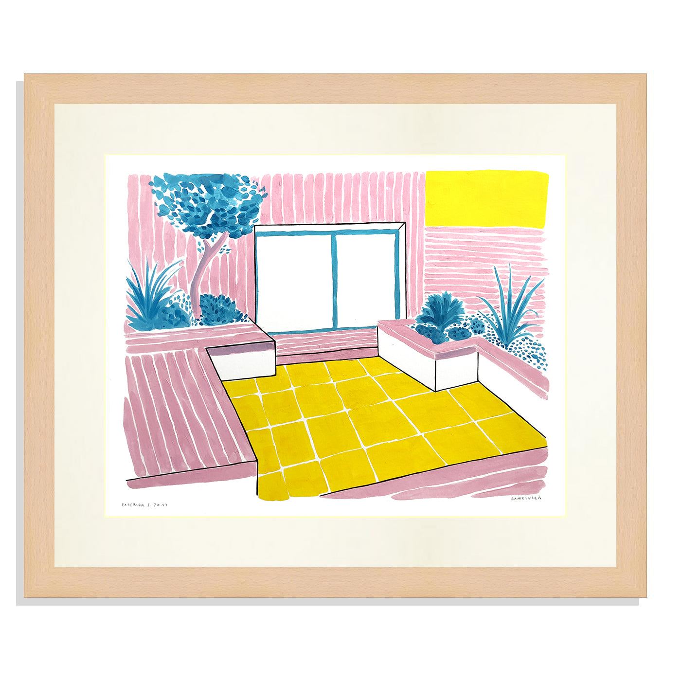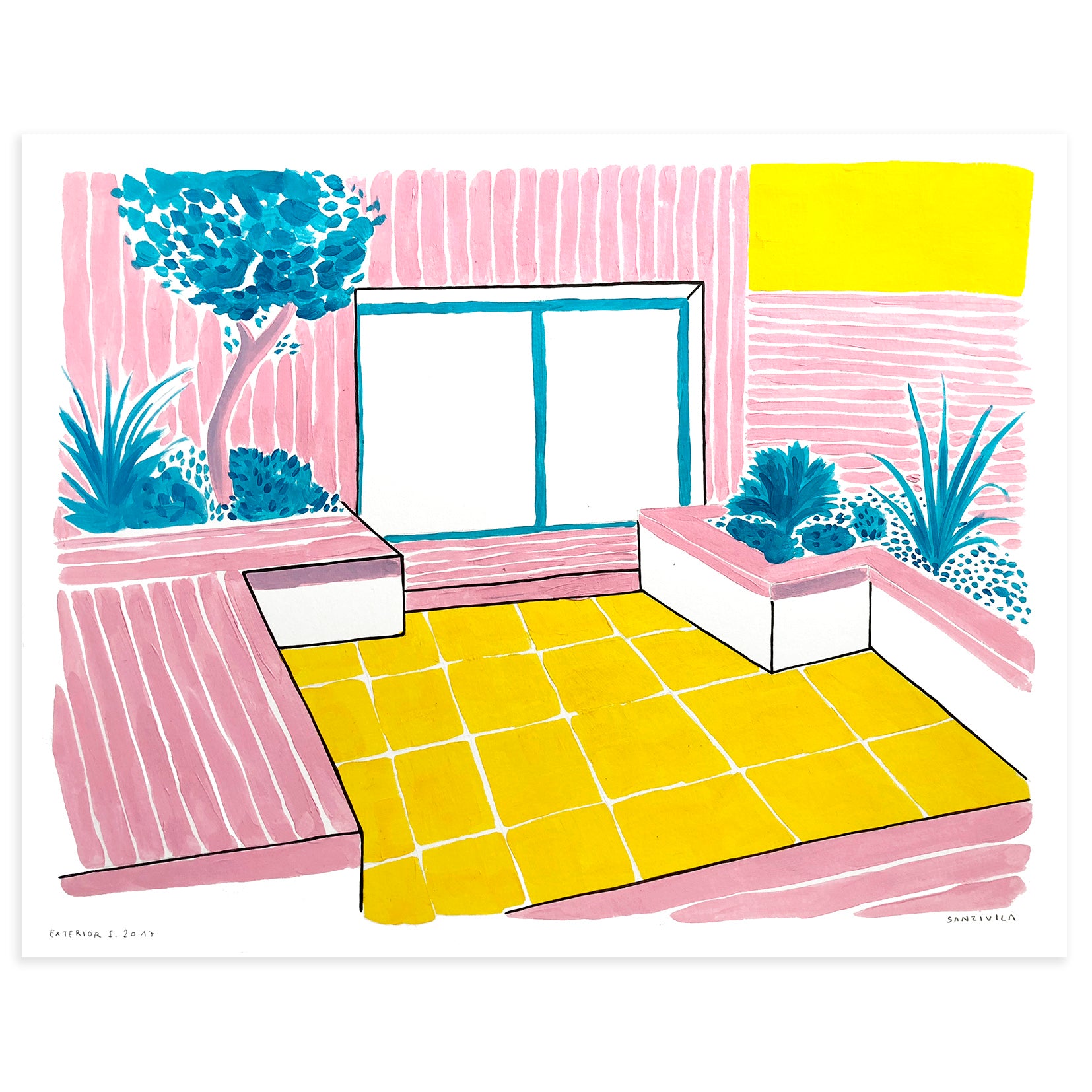This artwork belongs to a series about spaces and architecture by the illustrator Sanz i Vila. This unique artwork plays not only with what can be found inside and outside of each construction, but gives special importance to what is not, to everything that we consider empty. 'Exterior I', an architectural drawing, seen under the artist's usual colors (pink, yellow and blue), acquires a new dimension more emotional, almost childish and tremendously beautiful.