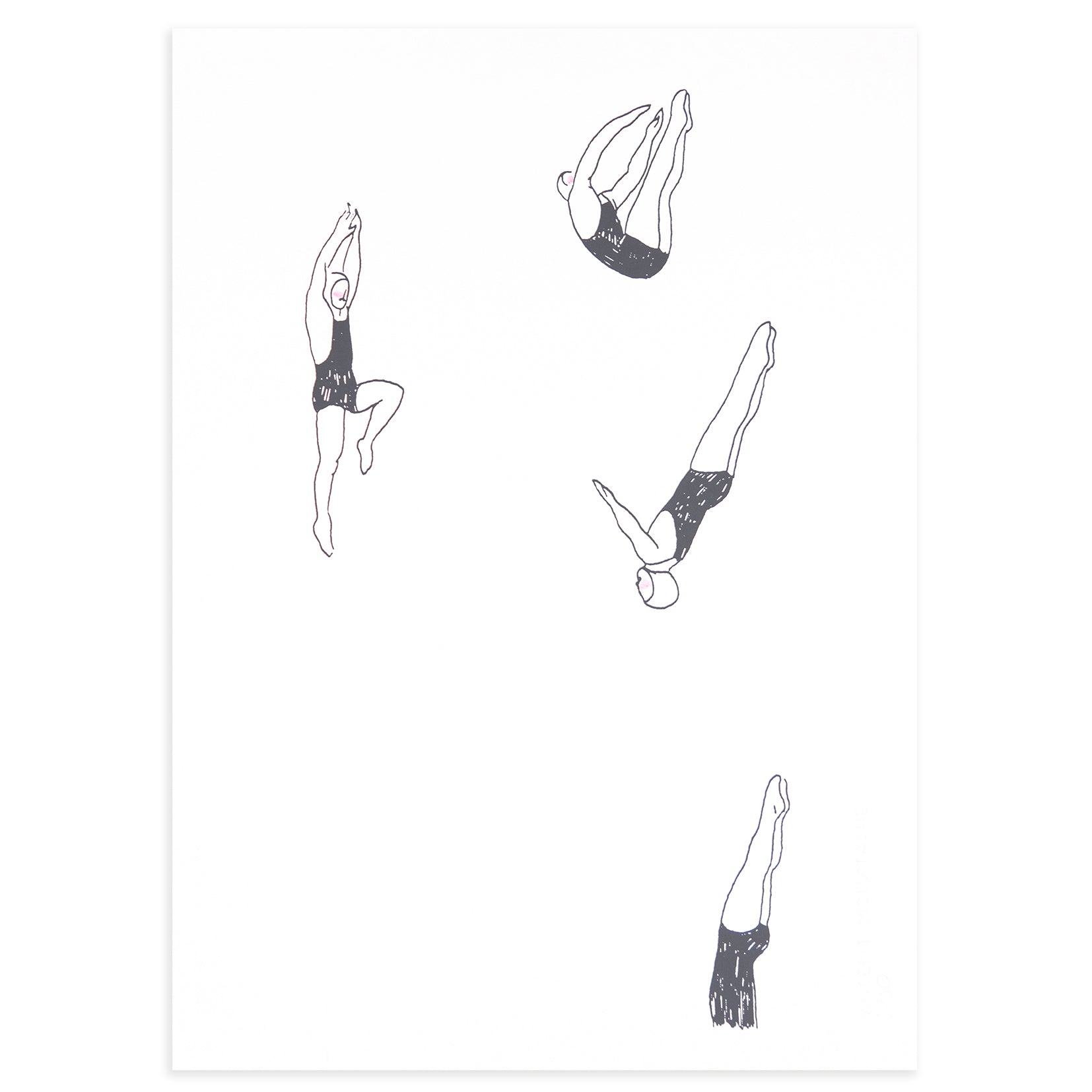 A gramophone by the sea. Dance. Jazz music. To kump into the water... "The jumps are scary, but the more you jump, the more you want to do it again," says the artist. This artwork represents a jump and is the capture of an ephemeral and fleeting moment. Enjoy the moment, we are nostalgic of this carpe diem even if we have not lived it. Where does this swimmer jump from? Where does she dive? It doesn't matter, only the jump matters. “I like swimming and the image of bathers. It is simple and elegant. Humans summed up in a swimsuit, a swimhat. The simplified human being, the silhouette of our bodies. There is nothing more true than to see you naked moving in the water”.