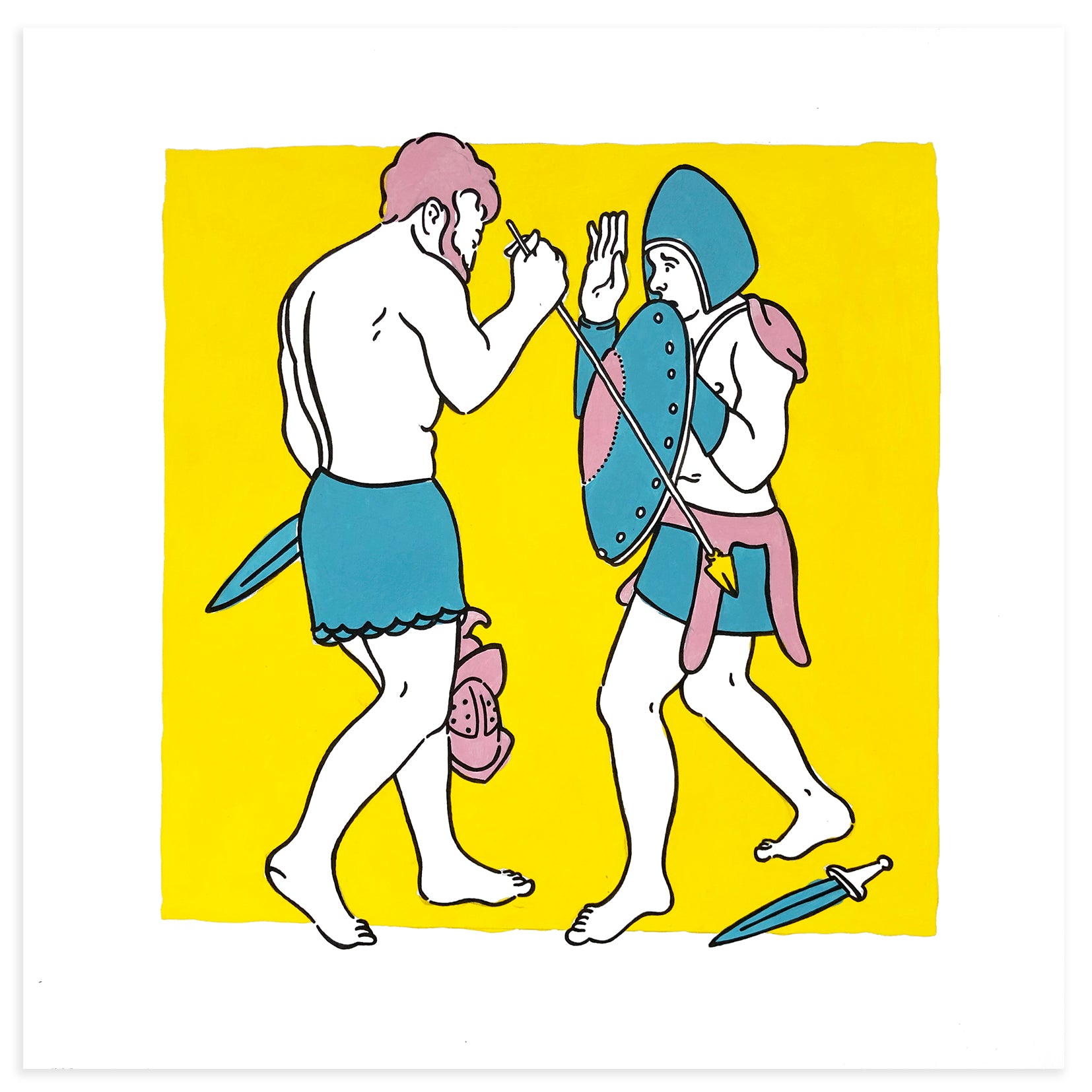 This artwork belongs to the exhibition Rome, a set of artworks where violence, pain and death are offered in the form of a spectacle, merge with Sanz i Vila’s cheerful color palette. Ten exclusive and original pieces that represent a creative milestone for the artist, in which movement and strength are channeled through the fight of these gladiators. Sanz i Vila defines it as follows: "The certainty of knowing we are going to lose the battle supports it happen. Hope could have opened the doors to a different future".