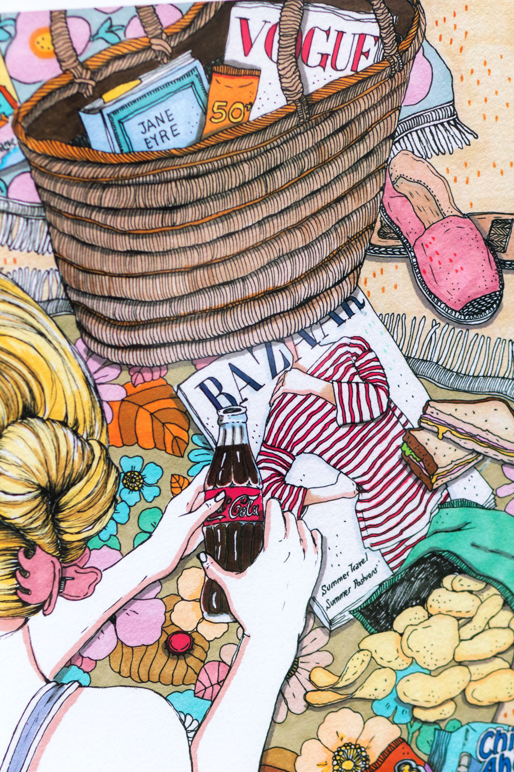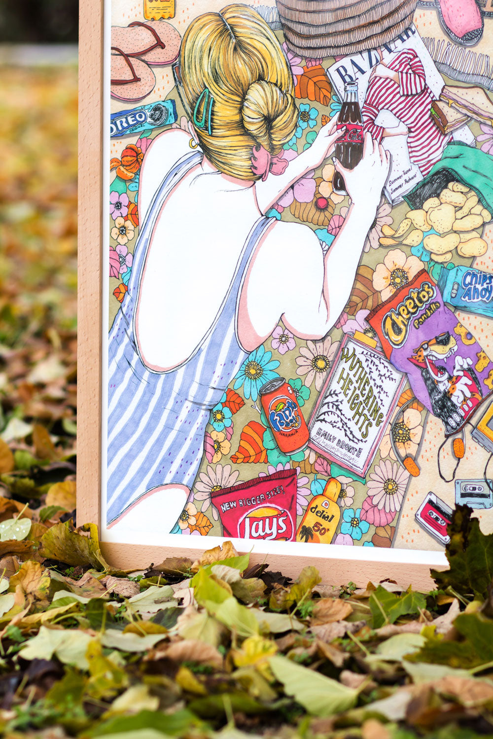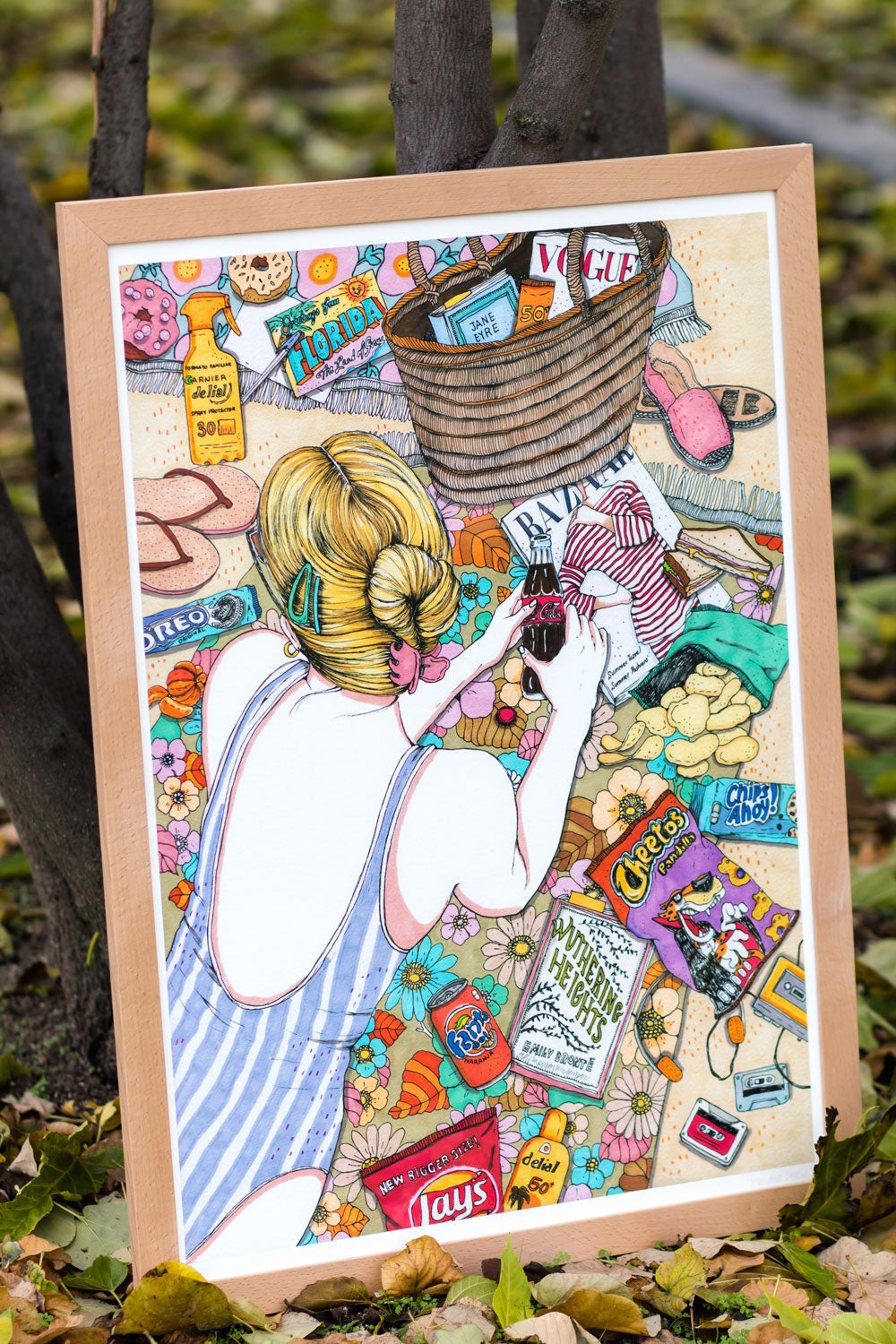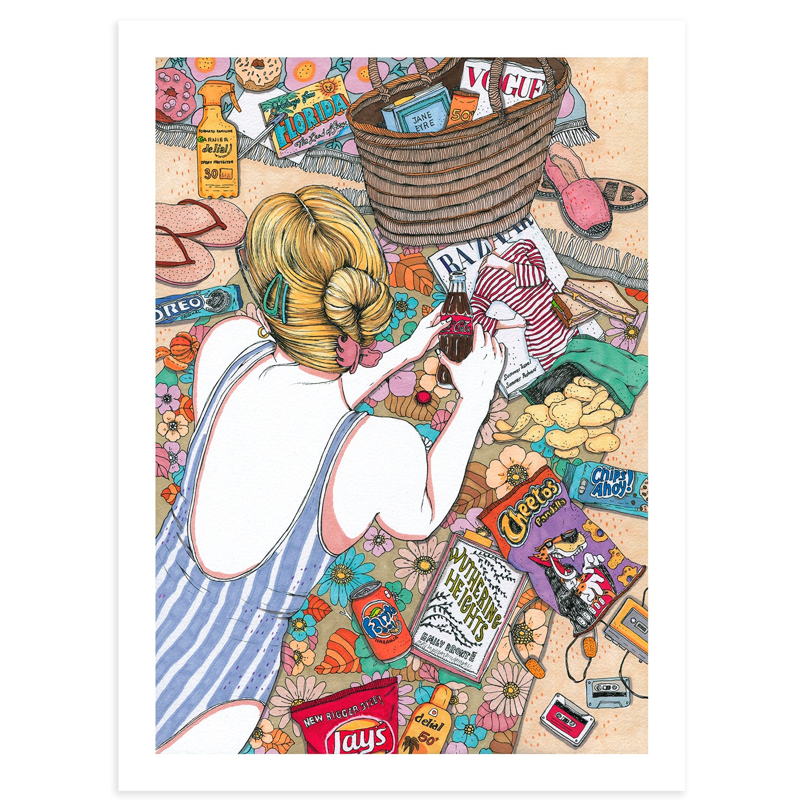 A memory. Some friends. To capture the moment and to feel free. The artist Ana Jarén recreates in this artwork her entire pictorial universe that walks between realism, value of everyday life and publishing industry’s pop obsession that influence her work so much. But, beyond the purely artistic, this piece condens a feeling in a minute: "The further I was from the beach, the closer I felt it. Through these illustrations I sought to remember the warmth of the sun, the softness of the sand and the relaxation that comes from lying on a towel full of the books that you haven't had time to read during the year or the snacks that you never allow yourself to eat. You listen the waves and you listen to yourself and savor the moments that will warm you the rest of the year".
