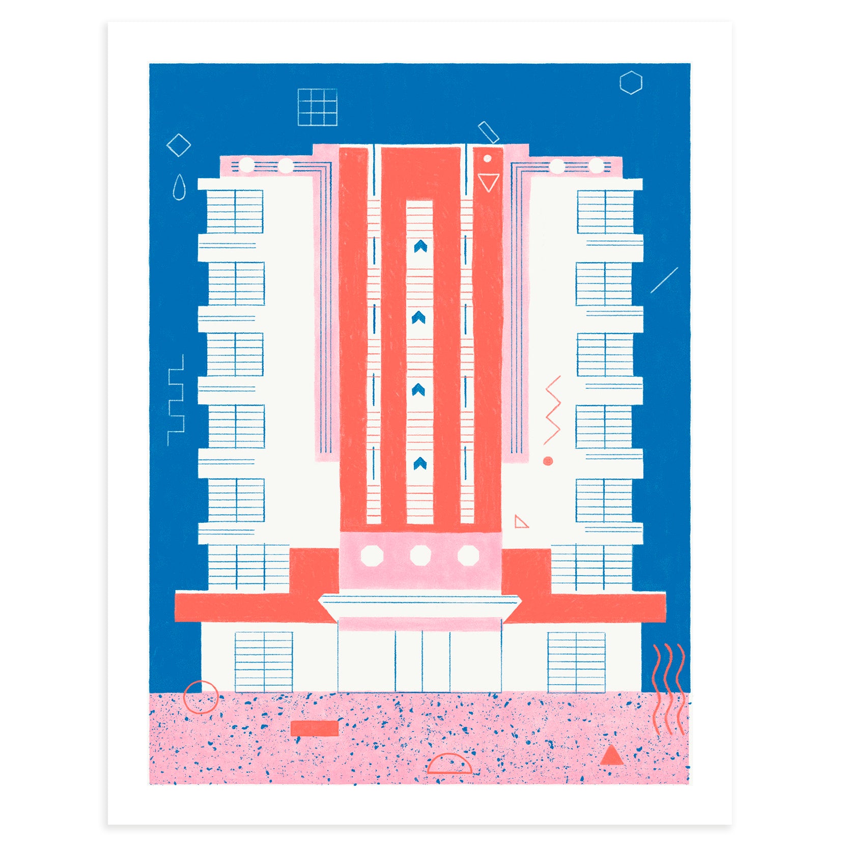 Architectural drawing, specifically of art deco buildings, marks this artwork made by the illustrator Carmen Casado. A positivist illusion of the cities, from Miami to Calcutta, where, according to the artist, she has sought "facades that look like machines in movement and that approach to futuristic aesthetics, in their day so modern and today decadent". This piece won the Third Art Hunter Contest of the Gunter Gallery in 2018.