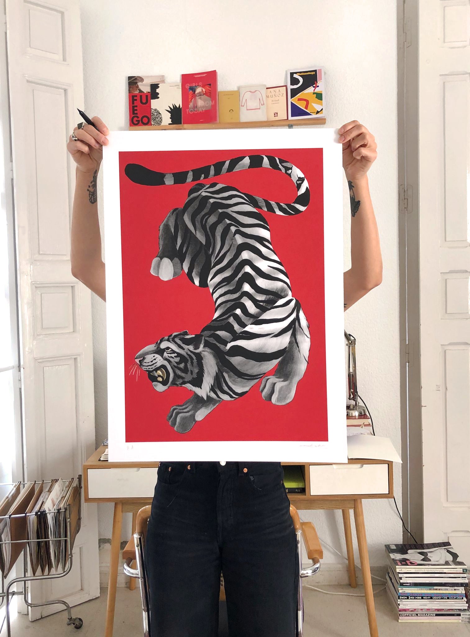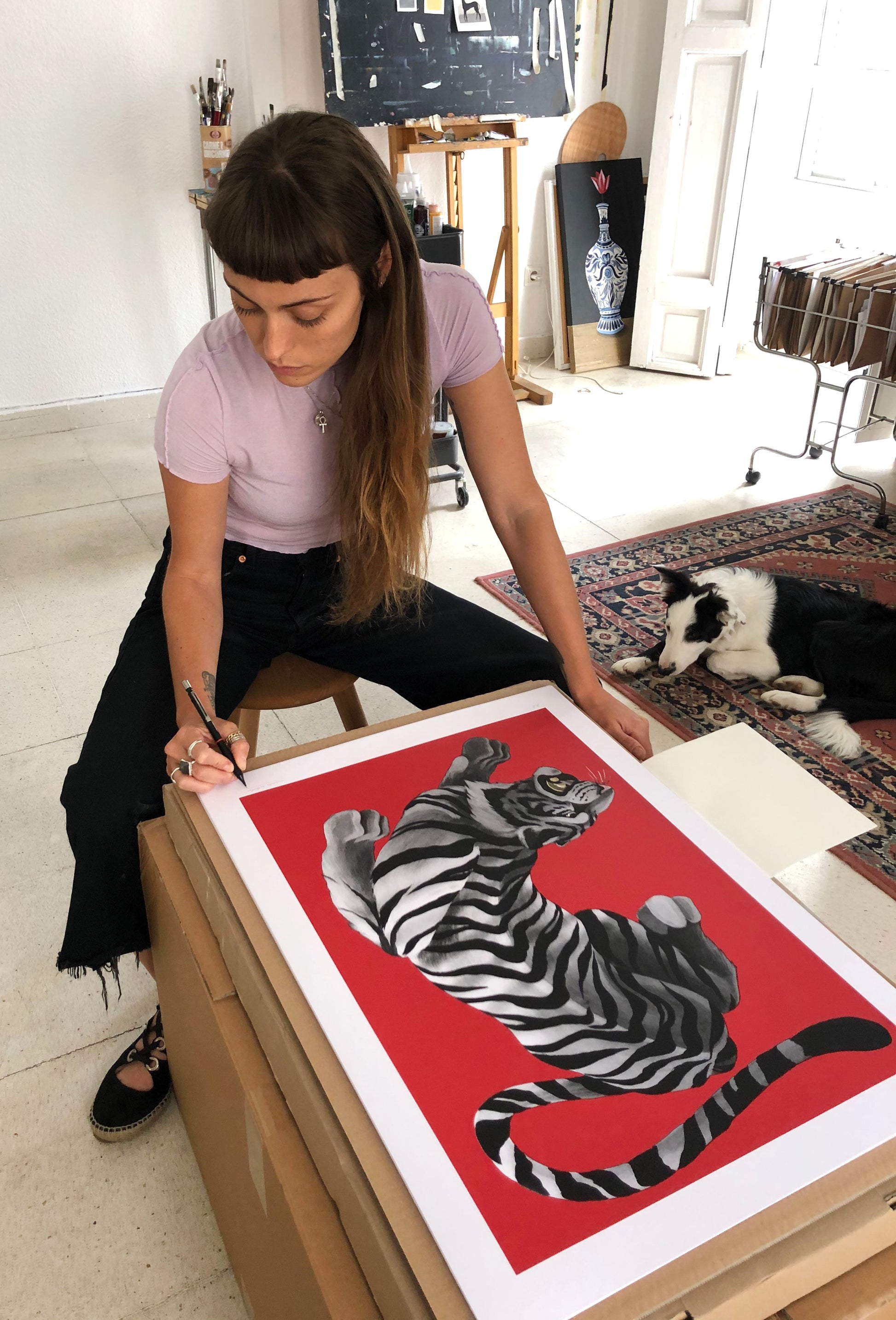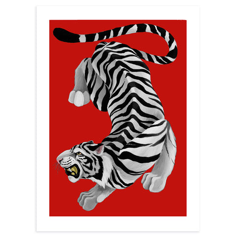 Byakko is a white tiger of Japanese folklore that symbolizes the western winds brought by the autumn storms, and the artist Mercedes Bellido, with this artwork, has wanted to pay it a tribute. "It is one of the four mythological monsters that represents the four cardinal points and it is a symbol of lightning and air," says the creator about this piece that talks about strength, Japanese culture and good luck.