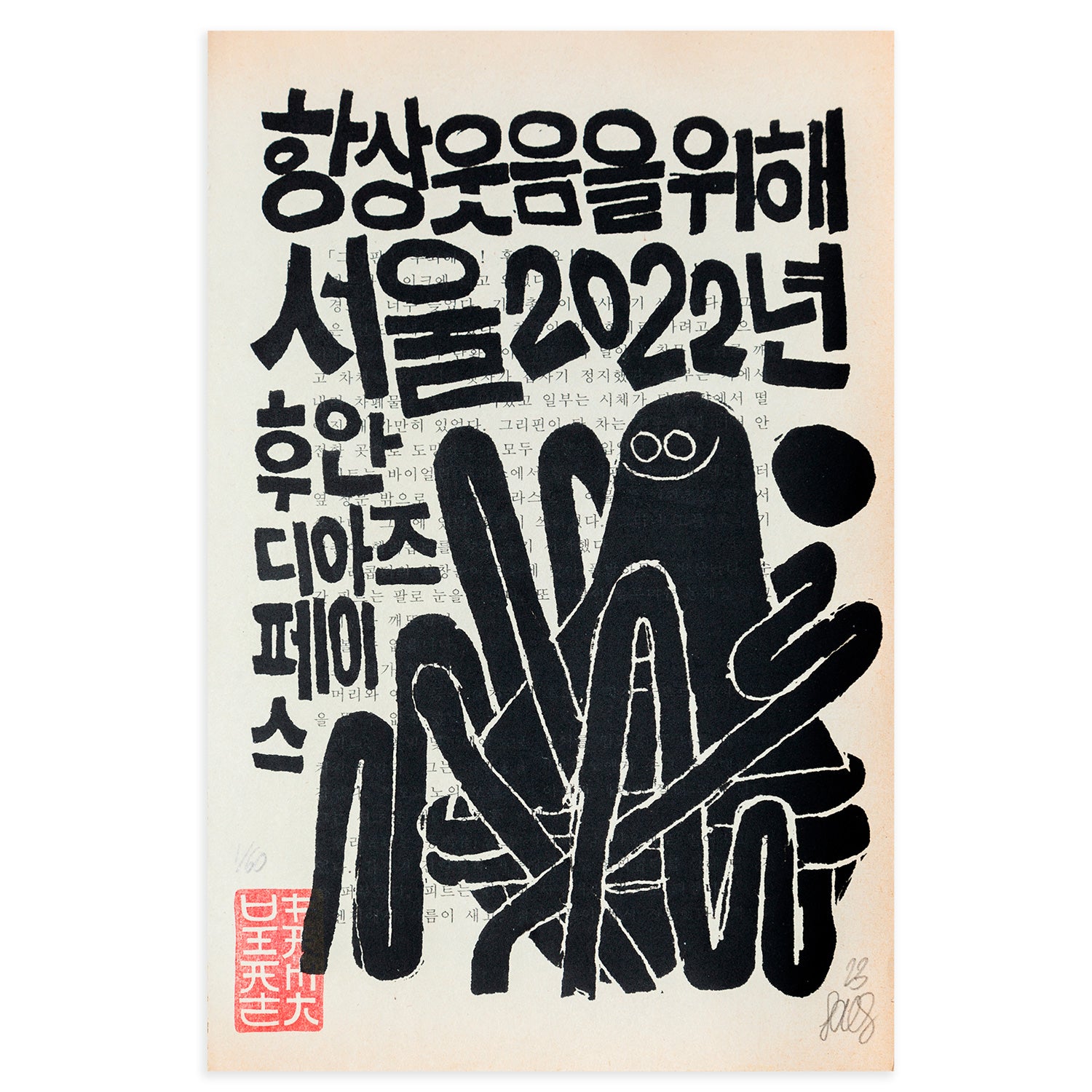 The artist Juan Díaz-Faes was invited to exhibit in Seoul (South Korea) in autumn 2022 within the Viva Arte exhibition, which reviewed the new Spanish figurative art with a great relevance in the urban scene. From that experience arises this serigraphy, firstly made by hand by the artist on the pages of an original book from that country, in which you can read in Korean "Juan Díaz-Faes exhibits in Korea in 22". This work includes all the usual symbolism of the Spanish creator, his most humorous feature close to comics and illustration, disciplines to which Díaz-Faes has been so related, always with success.