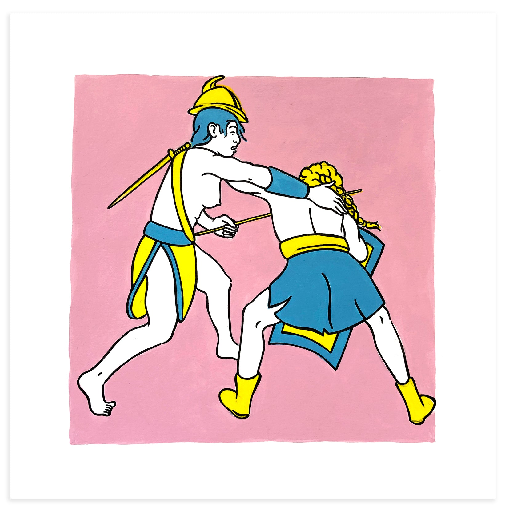 This artwork belongs to the exhibition Rome, a set of artworks where violence, pain and death are offered in the form of a spectacle, merge with Sanz i Vila’s cheerful color palette. Ten exclusive and original pieces that represent a creative milestone for the artist, in which movement and strength are channeled through the fight of these gladiators. Sanz i Vila defines it as follows: "A certain hit marks the end of the show, ending one life, changing another forever and brightening the afternoon for hundreds of them".