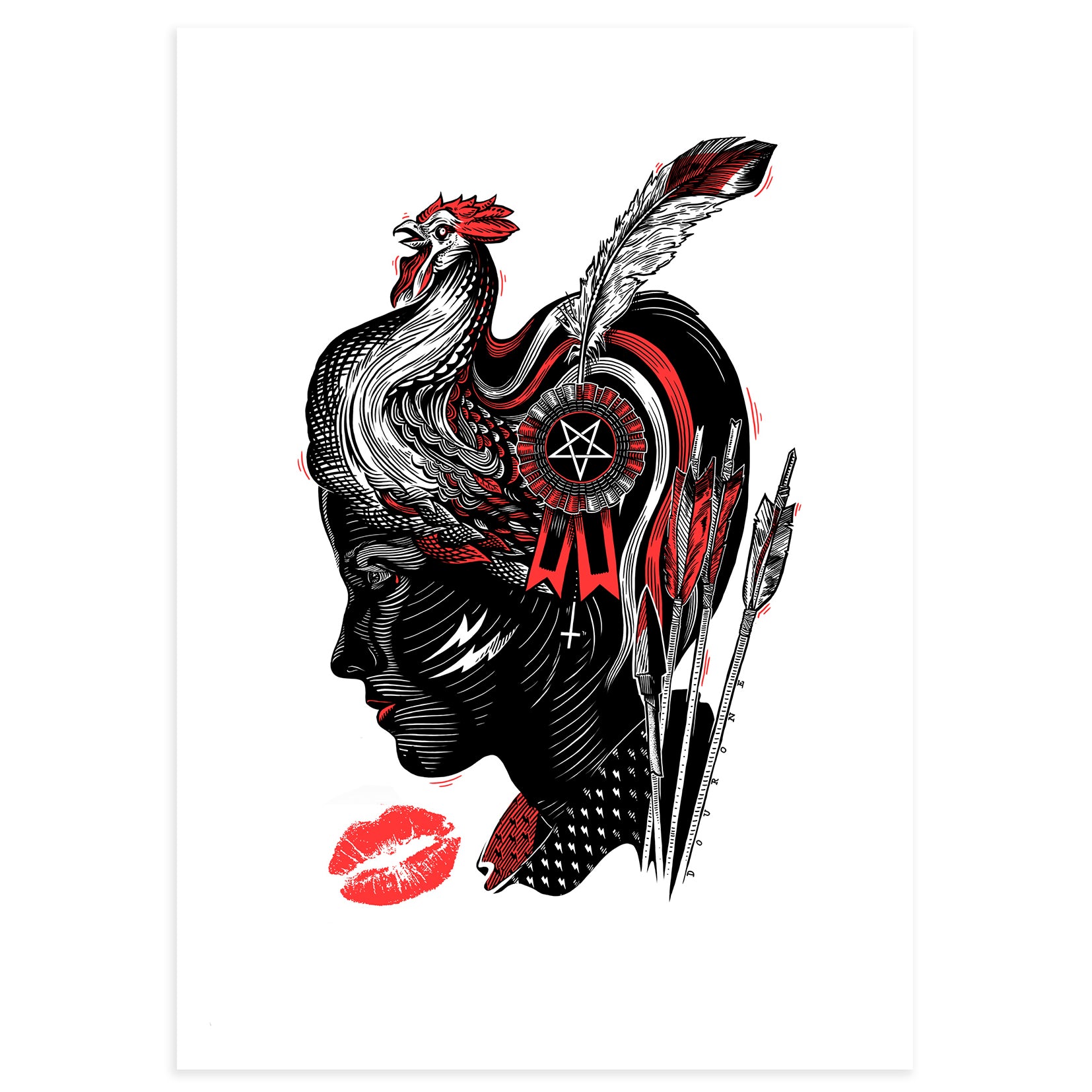 A woman warrior, a fighter. This silk screen made by the urban artist and illustrator Dourone, is the first of a series of works called 'Les Pétroleuses', where he represents strong females as countries. This one is France, where the rooster is part of the symbolism of the country of origin of the illustrated woman. Fabio Lopez (Dourone) created this illustration when he was living in Paris.