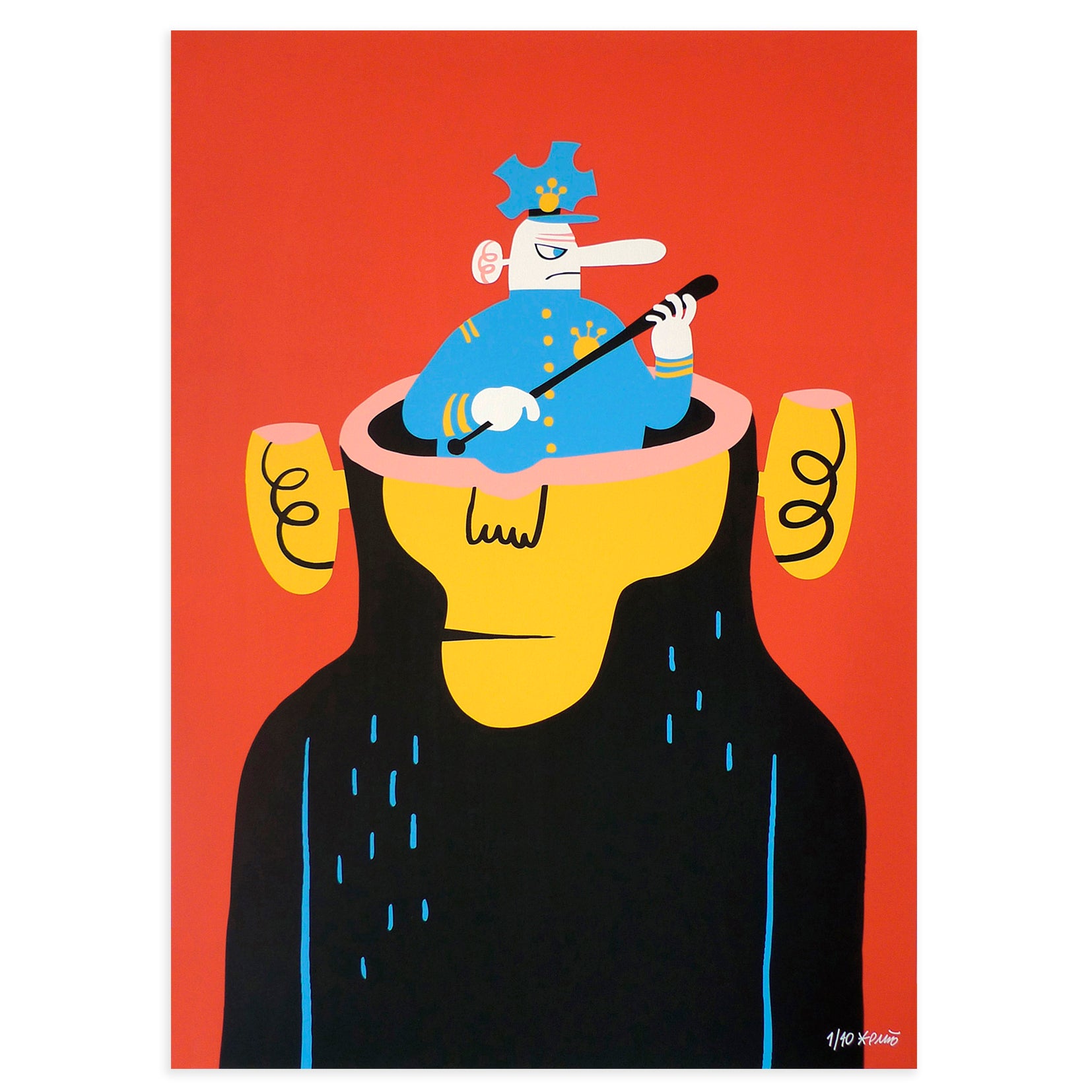 A lot of Puño's resources and philosophies are represented in this work. On one side the social and political side of a policeman that comes out of a headless monkey, maybe as a metaphor of the type of vision and safety that's seen on the streets, more animal, more control, not as innocent . . . the cartoonish aesthetic, the highlighted and simple lines and the colour of its characters are perceived in this positive and fun silk screen series, which can fill the corridors of your home with humour and even be a wireless home safety system.