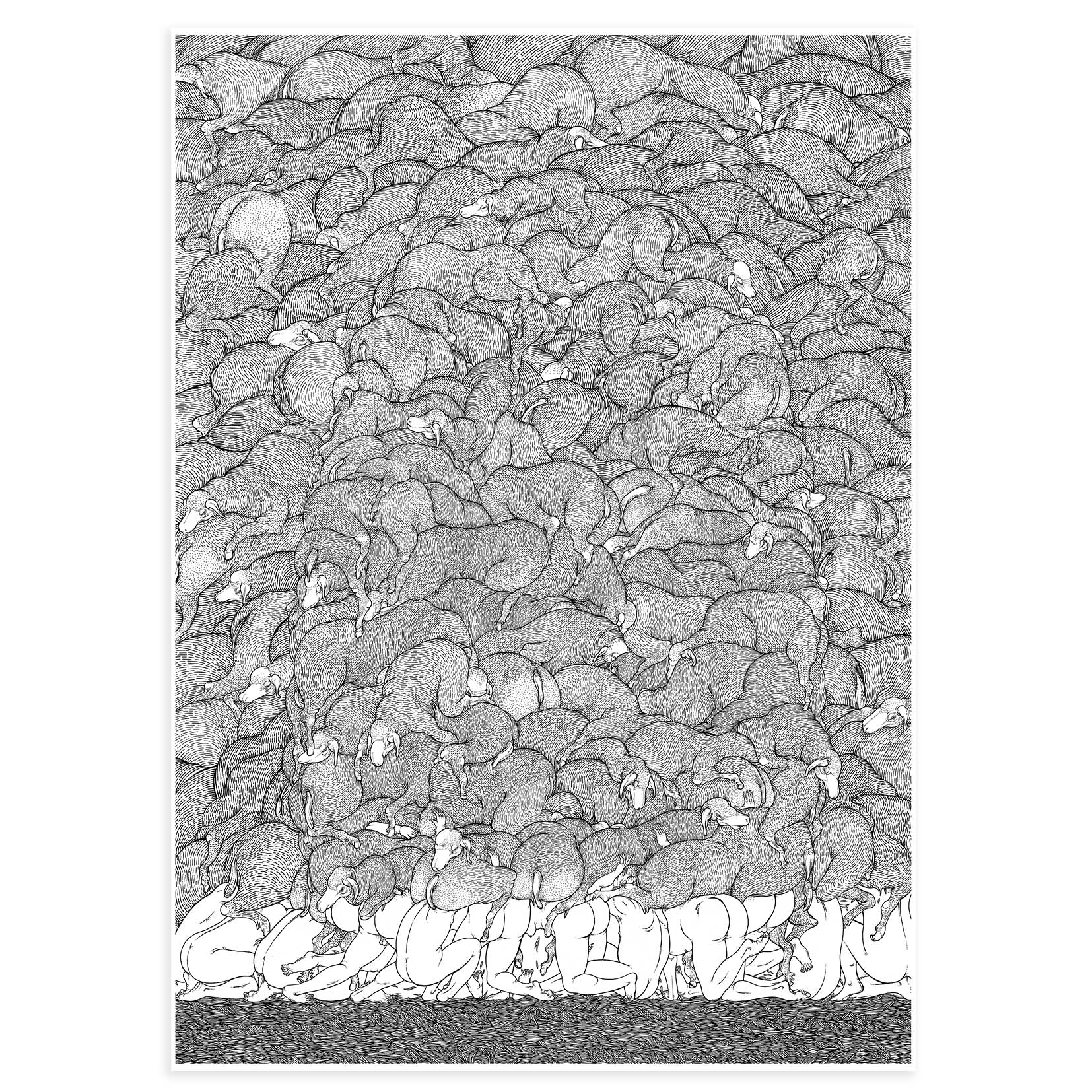 Accumulated backsides, tails, ears, and legs, all over each other. This is one of the most fleshy and viceral pieces of the artist Santiago Morilla, inspired from a modern cavern of the greek myth of Polyphemus. In his own words "we'll put up with the heavy sheep's camouflage which will help us, maybe, to trick the capitalist cyclops which devours us peacefully at his all-over wall; we know that collectively we are stronger; 'nobody' is, Ulysses already knew it, but today we still haven't resigned ourselves to our ornamental future en the powerful social cavern, as mere food for the beast”. This work speaks of collective enduance, of baroque wealth, and soothed power. A small and profuse story of cyclops.